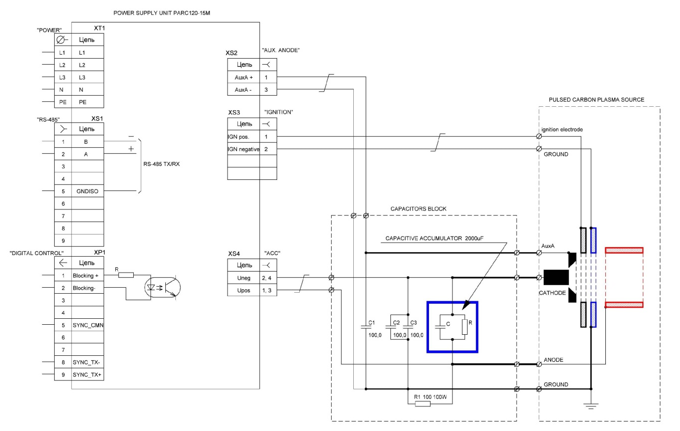 The PARC 120-15M power supply is designed to power and control the PARC 29 pulse electric arc evaporator. Pulsed electric arc evaporator is an electrophysical device according to the following scheme: